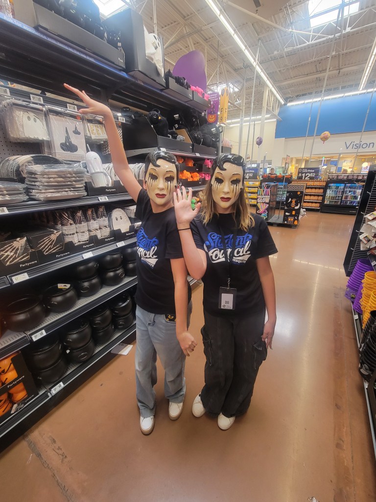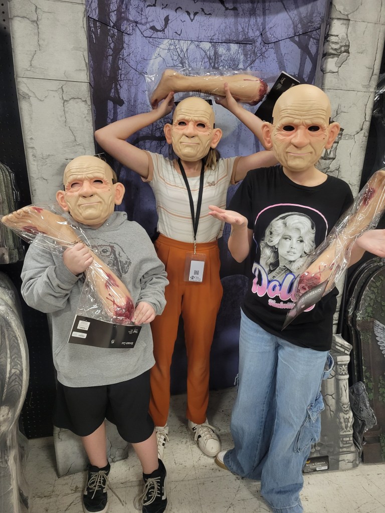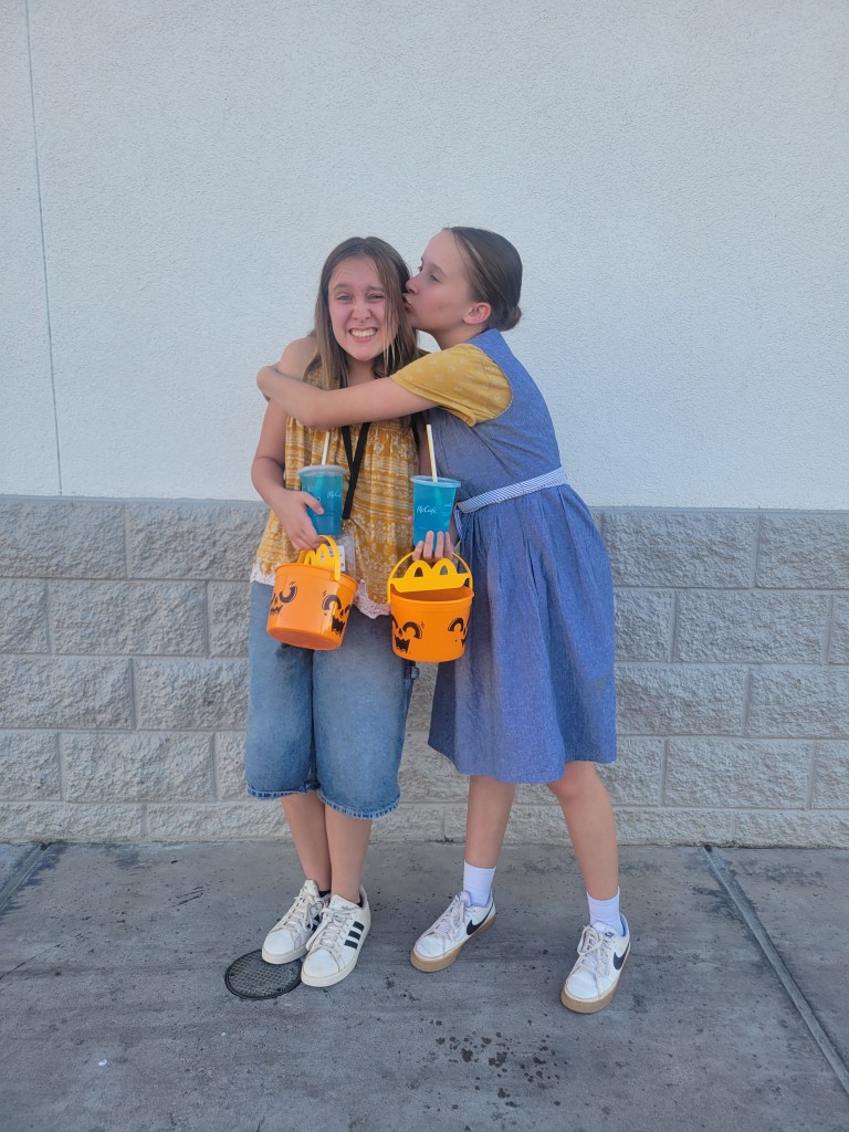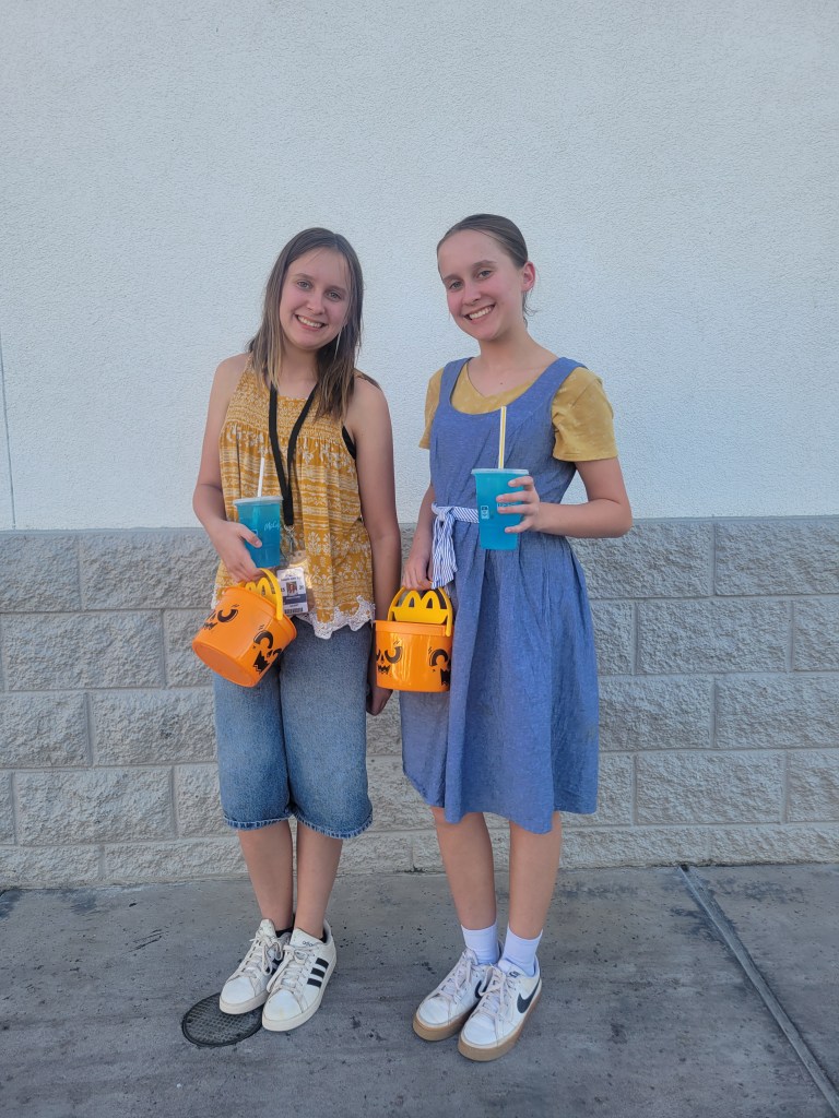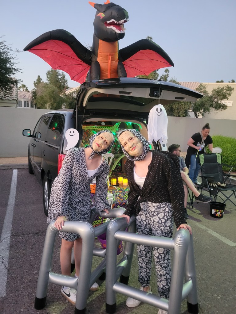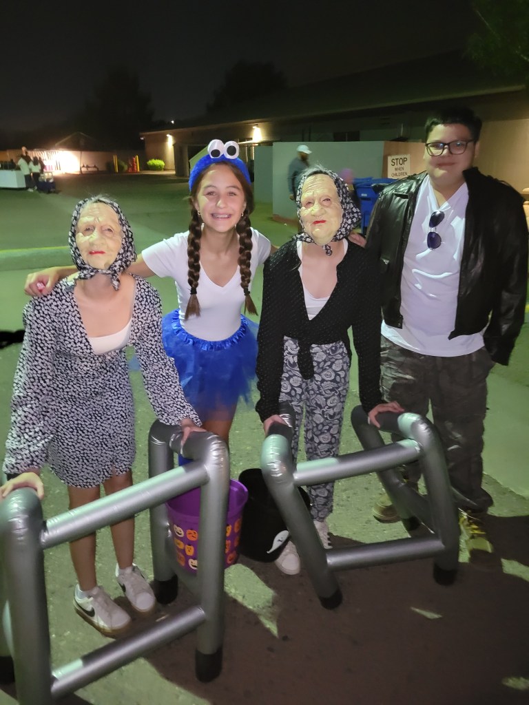 The FUNNIEST moments of the night were watching Hannah and Emma as old ladies. This was the first time they WANTED to look alike. They both stayed in character the entire time, never speaking, only making gestures. And to my surprise, they took this role to the next level as they loved frightening the heck out of all the little kids—and some adults too.