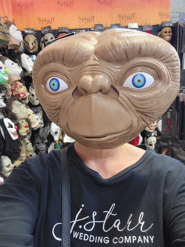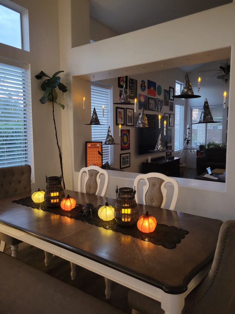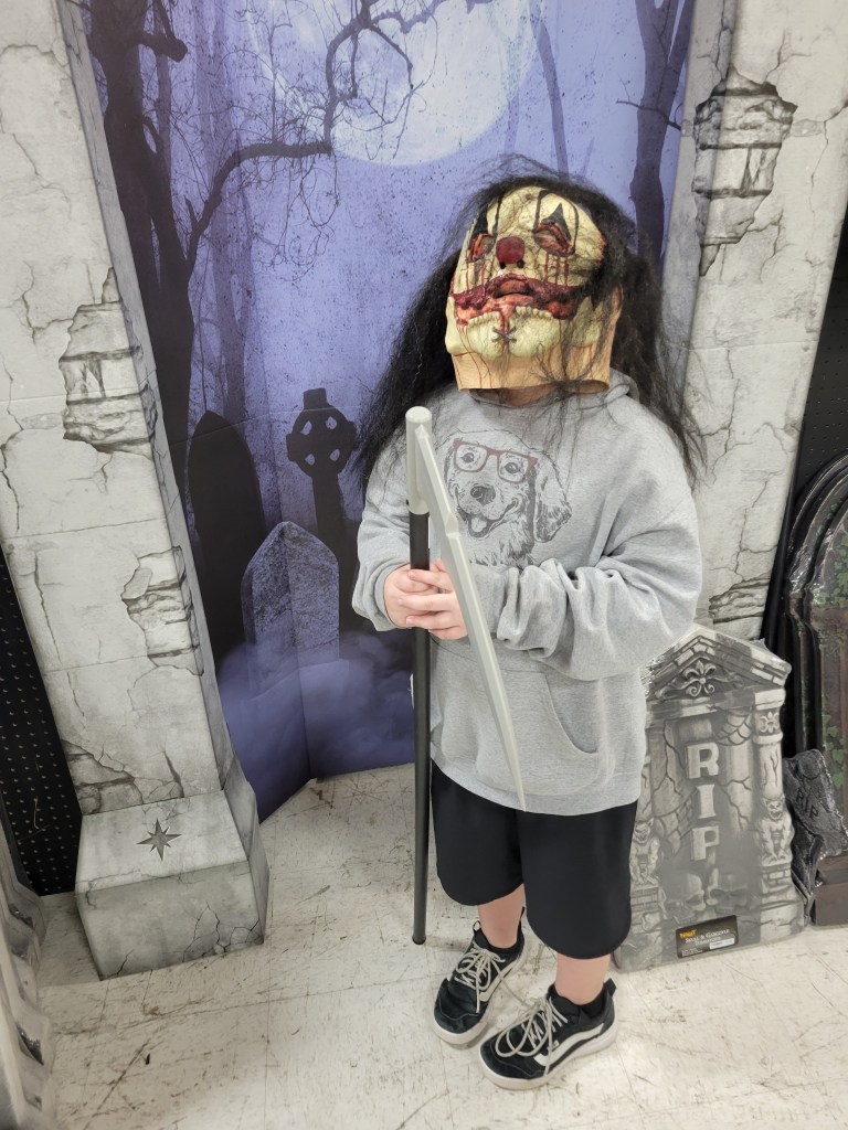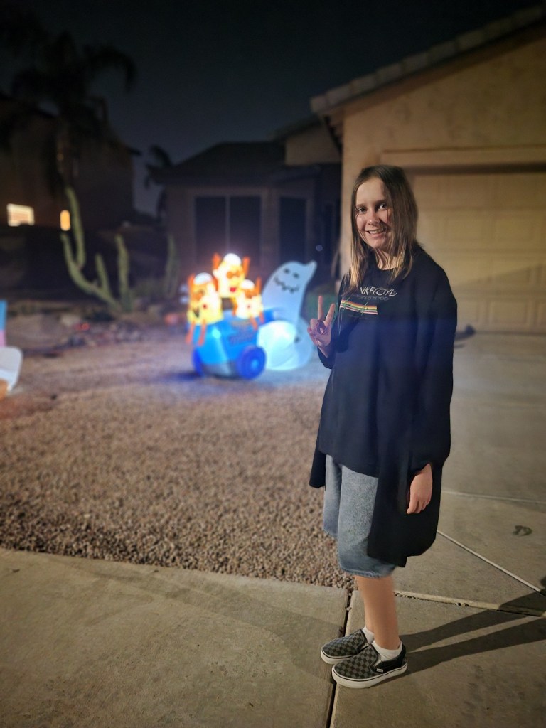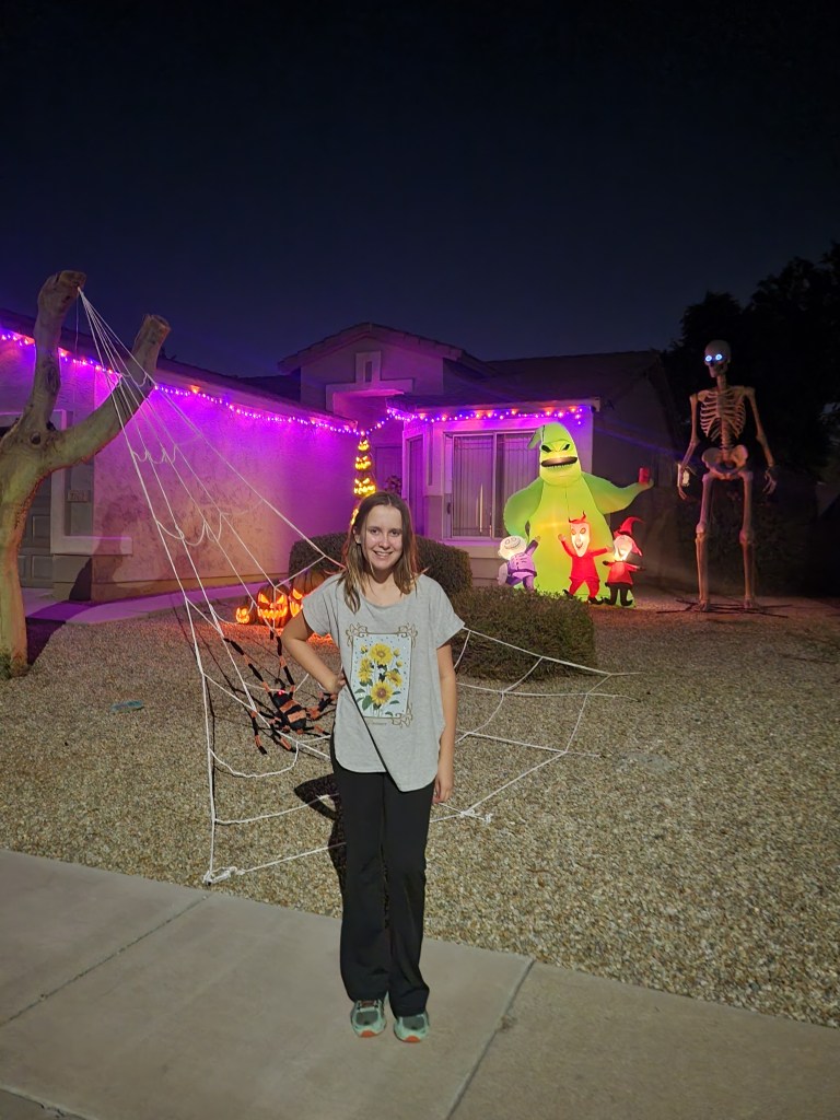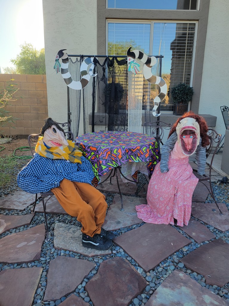 Emma had the idea to create a fun little “Beetlejuice” scene in the front yard. I attempted a backdrop using Justin’s photo-backdrop framing, although I think I’m going to buy myself some pipe-and-drape framing in the future so I can better decorate this super-tall home.
